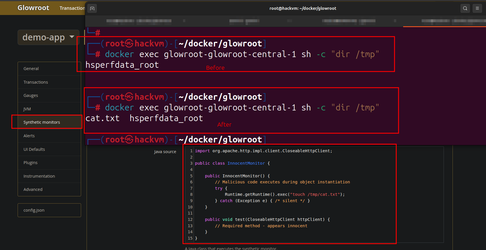 The execution does not happen in the demo app container; it executes on the Glowroot main container. So now, you have a complete RCE on the Glowroot container.